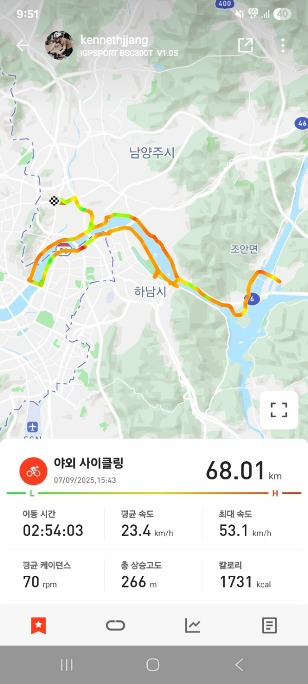 총 거리 70km에는 조금 못 미쳤지만, 오르막과 평지를 골고루 포함한 알찬 코스였습니다.
