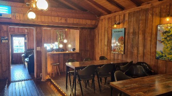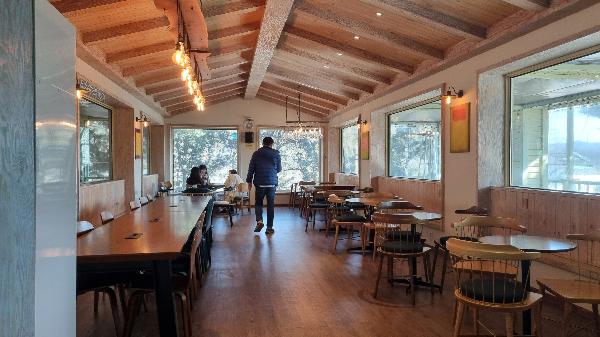 1,2층으로 구성된 실내는 나무 특유의 온기가 감돌며, 대형 카페 특유의 콘크리트 느낌 대신 포근한 산장의 분위기를 자아냅니다.