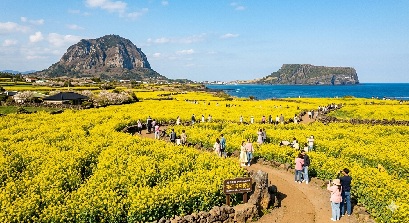 - 상세설명 : 특히 산방산 근처나 성산일출봉 광치기 해변 쪽은 푸른 바다와 노란 유채꽃의 대비가 환상적입니다. 3월 중순이면 벚꽃도 슬슬 고개를 내밀기 시작하니, 시기만 잘 맞춘다면 유채꽃과 벚꽃을 동시에 만나는 행운을 누릴 수도 있습니다.